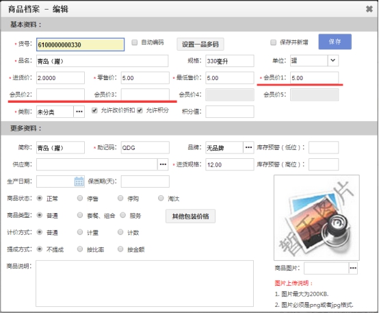 通过【基础数据】-【商品档案】选择需要修改的商品档案设置所属会员价。(注:多会员价最多可设置5个,开启后商品档案会显示5个,如商品设置里面选择的是3个会员价,那么商品档案里面另外两个将变灰不可填写。)