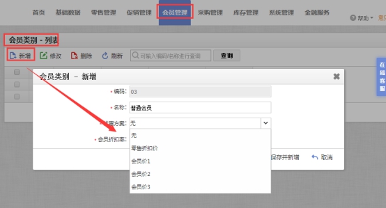 通过【会员管理】-【会员类别】新增会员类别信息,填写会员类别名称、下拉选择优惠方案可看到刚刚所设置的多会员价信息,选择此会员类别享受哪类会员价,点击保存即可。