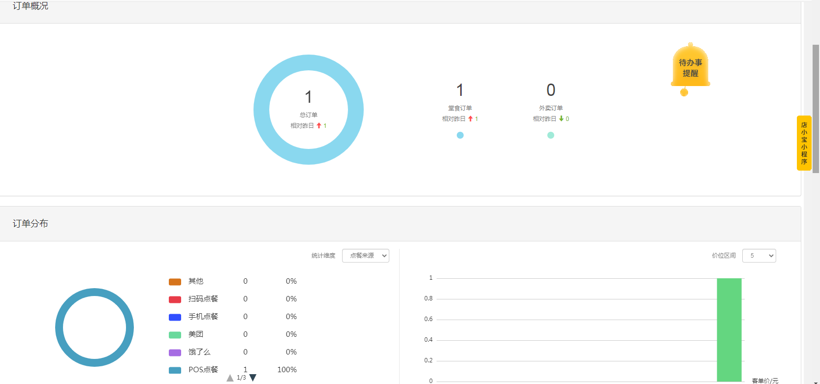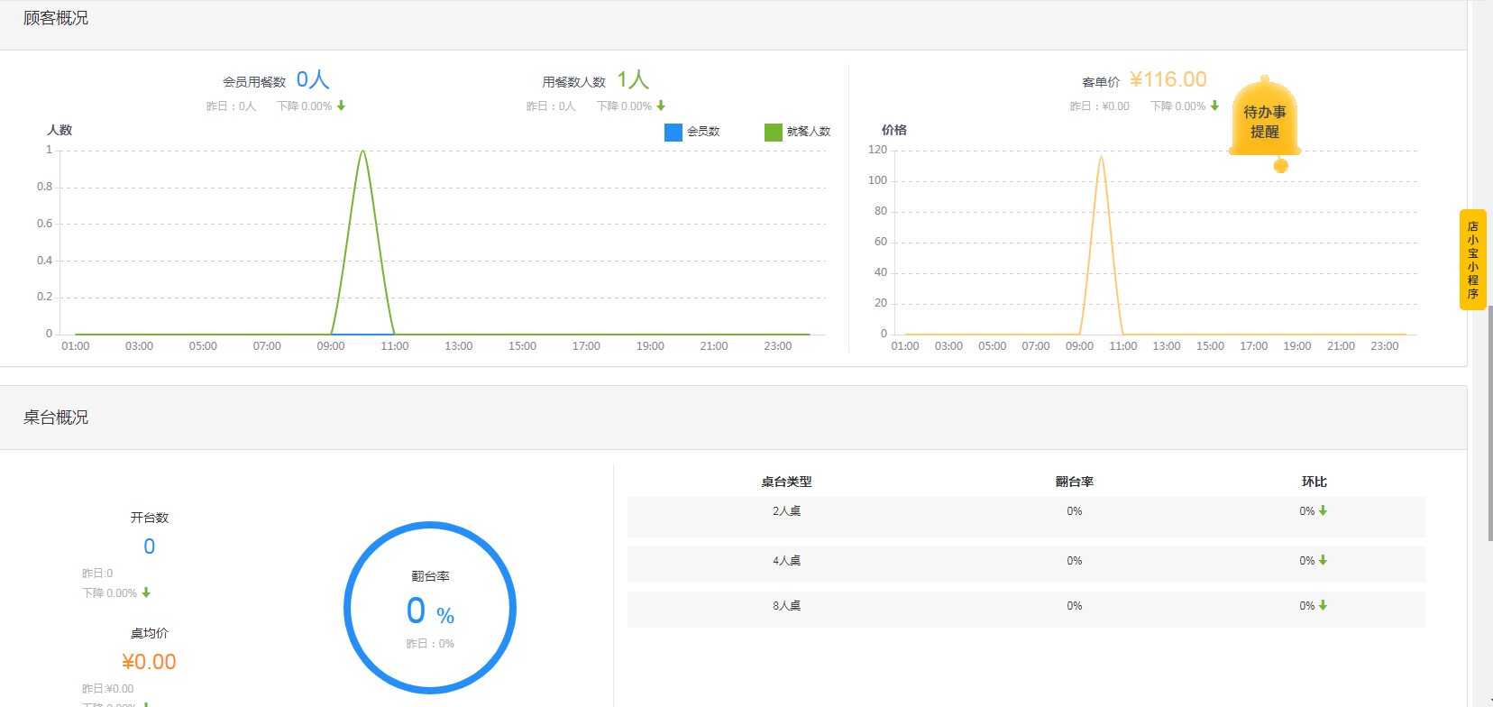 首页呈现的是当日营业情况与待办事提醒(点击显示具体内容),包括营业概况、销售概况、订单概况、订单分布、顾客概况、桌台概况、销售排行。 文档更新时间: 2025-05-12 10:44 作者:zhouxiao