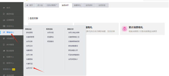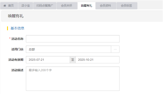 1、后台营销中心-会员关怀中,新增唤醒有礼活动