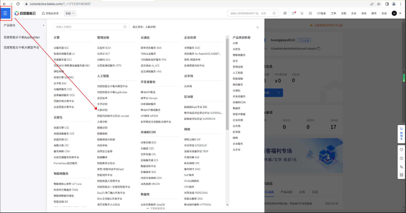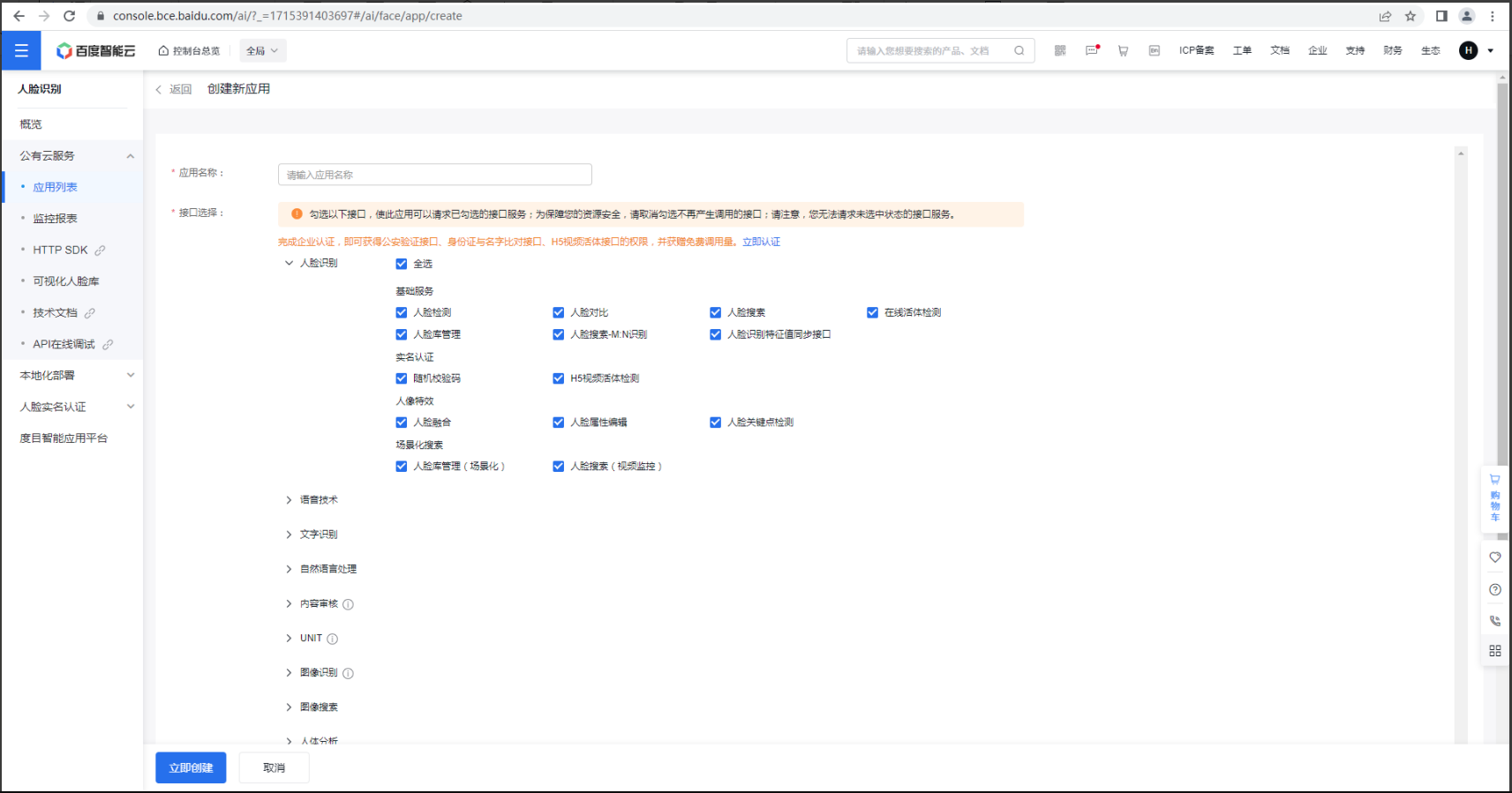 进入百度智能云,选择人脸识别