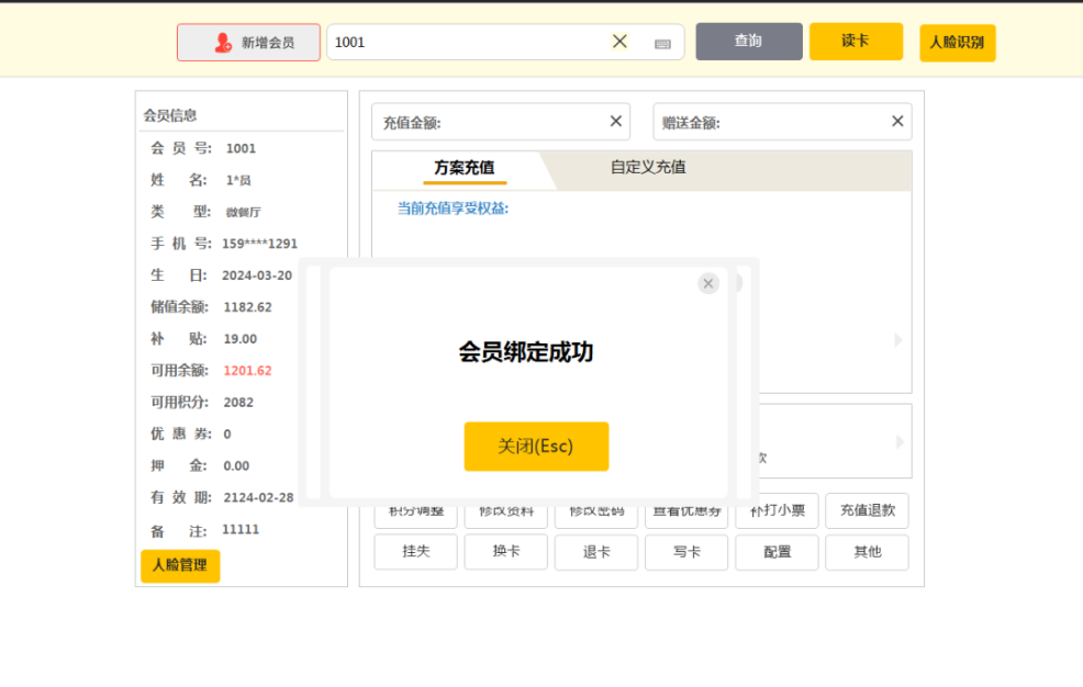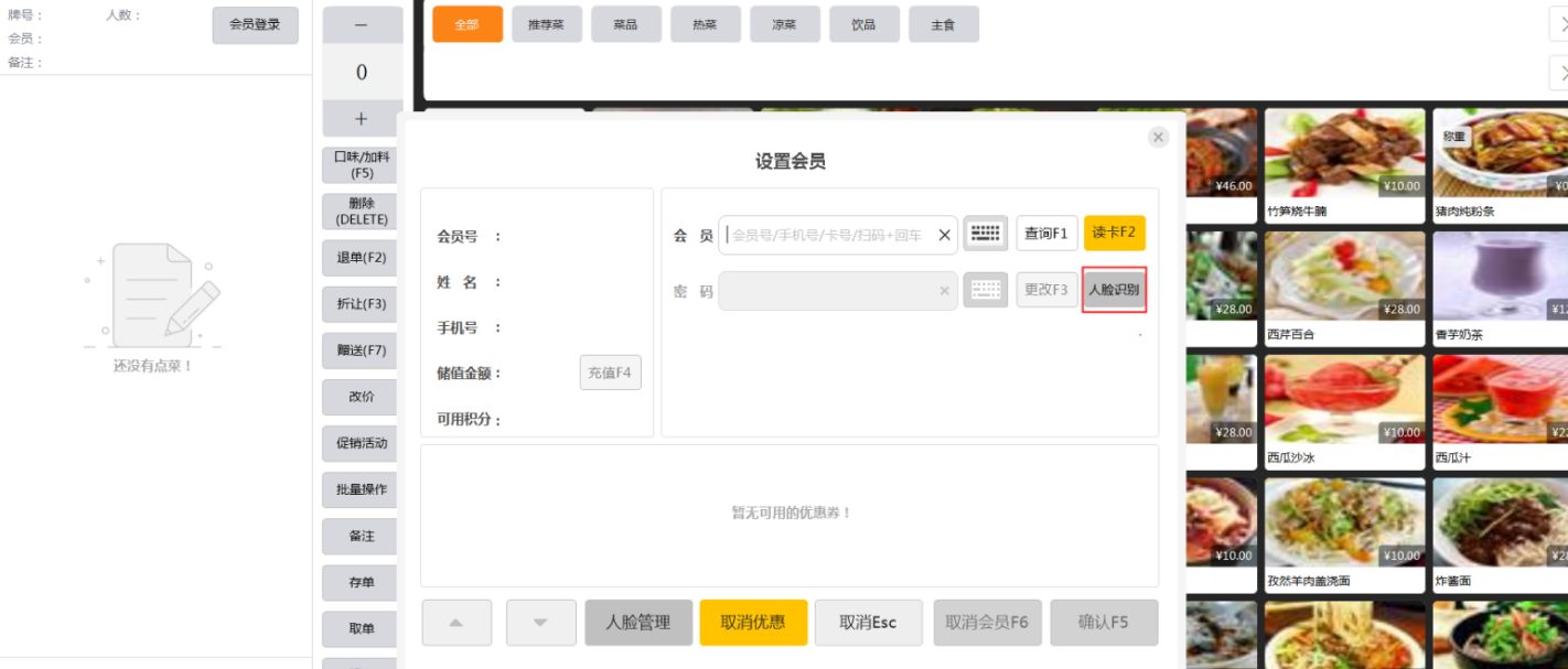 人脸绑定成功后在营业、点单、会员界面有关会员录入的地方点击人脸识别,录入绑定的人脸即可查询出对应的会员信息