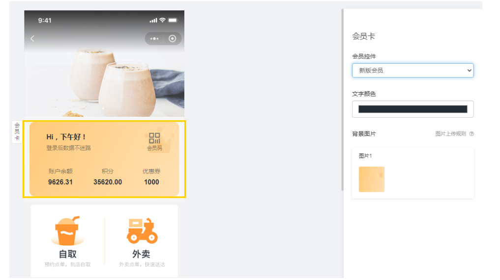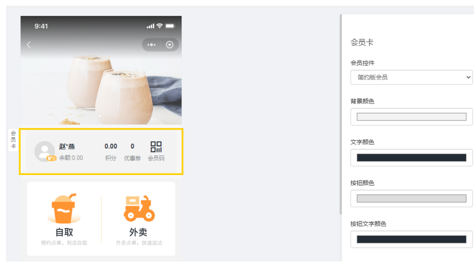 控件占用的地方更小,显示会员头像、姓名、余额、积分、优惠券和会员码;
