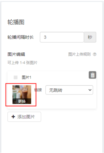 点击添加图片按钮,轮播图片可以上传1~4张图片,图片规格见下图: