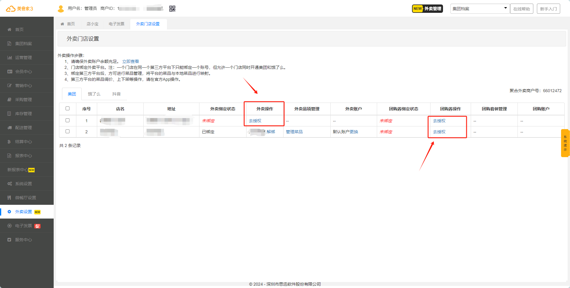 商家后台的“外卖设置→外卖门店设置”页面选择对应门店进行“去授权”,包含外卖订单授权和团购券授权。