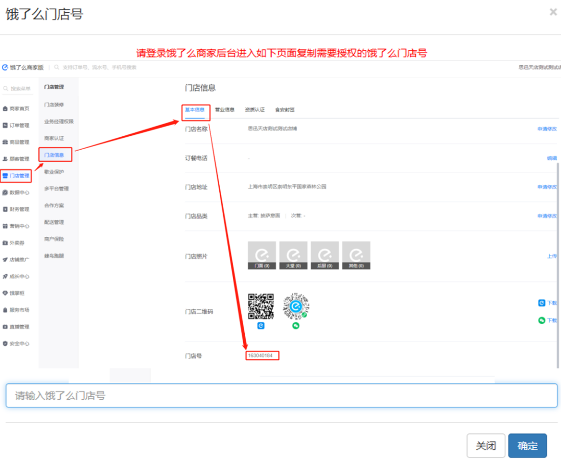 点击“去授权”,录入饿了么的“门店号”。饿了么的“门店号”获取路径登录饿了么商家后台“门店管理→门店信息→基本信息→门店号”,如下图:
