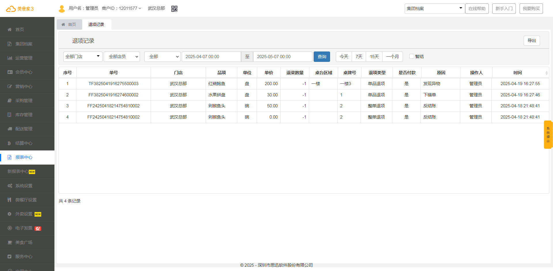 查询时间段内门店品项退菜流水数据。
