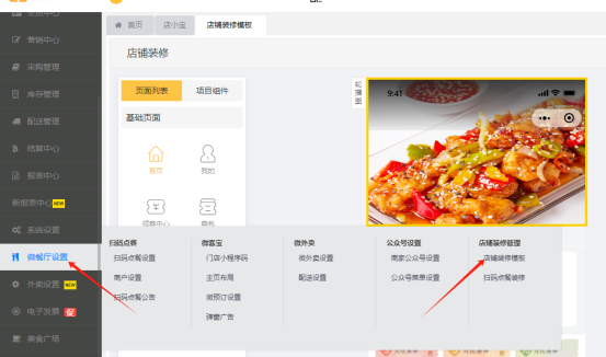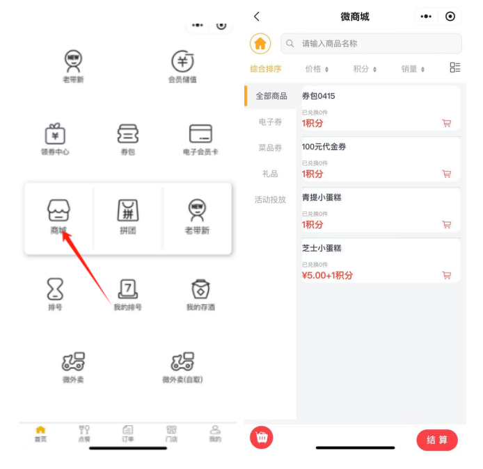 在微餐厅设置-店铺装修模板中,增加积分商城入口。选择项目组件,添加业务入口,链接选择商城。