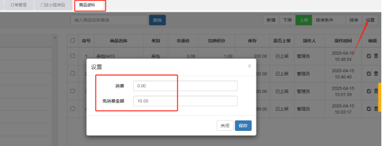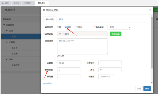 后台会员中心-积分商城,新增商品资料。商品类型有3种,实物、优惠券、券包,需要分别新增。