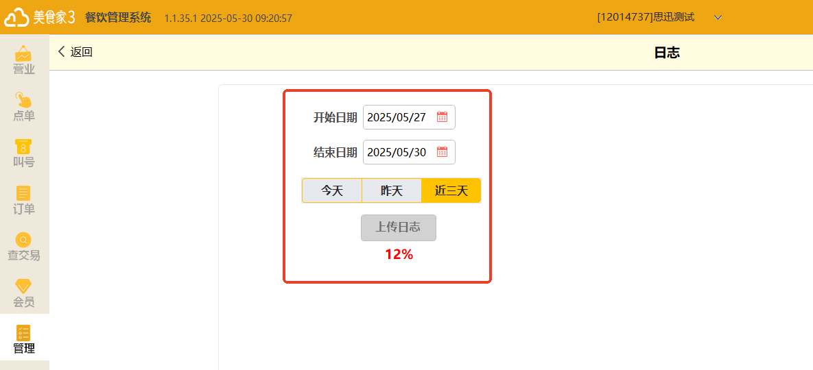 (2)选择开始和结束日期后点击上传日志,上传进度为100%即可上传成功。