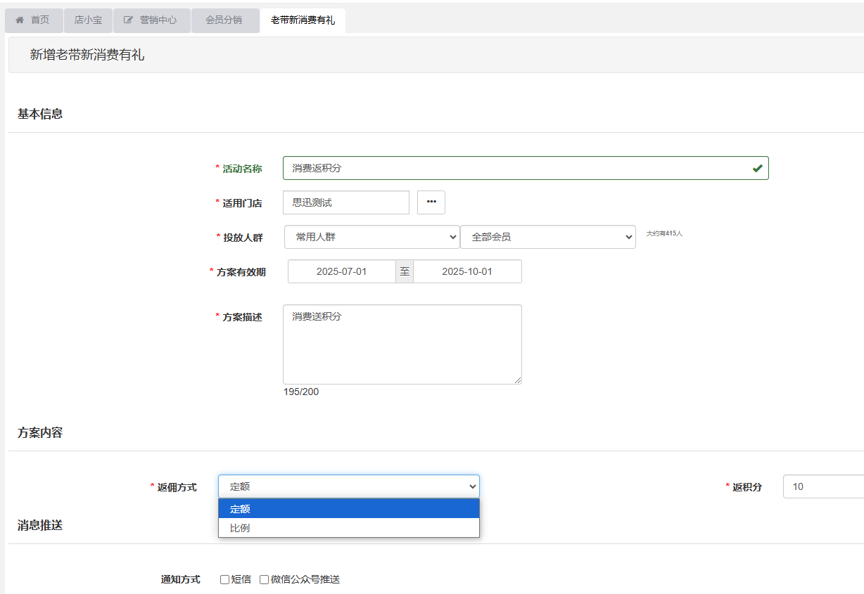 2.填写基本信息和方案内容包含活动名称,适用门店,投放人群,方案有效期,方案描述,返佣方式等信息。