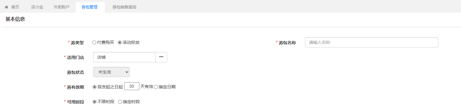 (1)券包管理——基本信息,券类型选择“活动投放”,录入券包名称、选择适用门店、券有效期等信息。