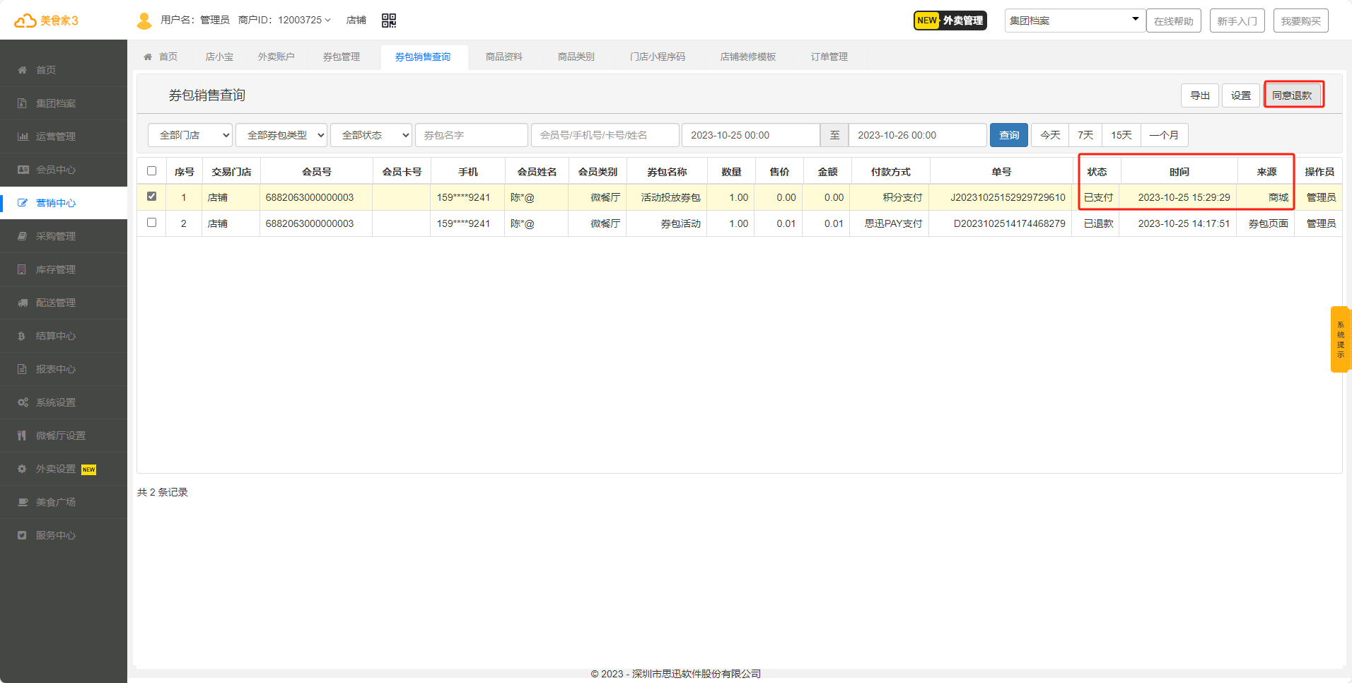 扫码券包二维码进行购买,付款完成后在券包订单中可以查询到已购买的券包。若想退券包,直接点击申请退款,软件“券包销售查询”中查询到需要退款的单据且状态是“申请退款中”,选择此单据点击同意退款,成功退款后单据状态修改为“已退款”。
