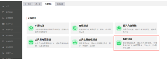 在结账界面,当订单金额达到起充金额,就会展示智能储值方案,选择相应方案进行储值即可。