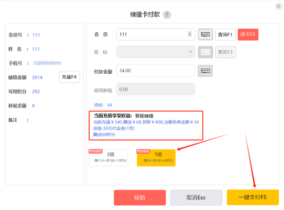 前台结账界面,选择储值卡支付,查询会员之后,选择智能储值方案,可以查看当前充值享受的权益,点击“一键支付”,即可完成充值和订单支付。