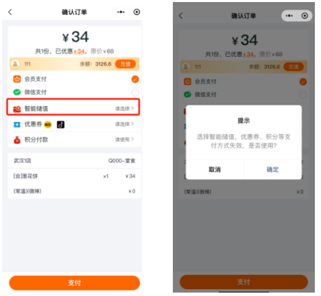智能储值启用后,前台储值支付界面和扫码点餐支付界面均展示智能点餐;